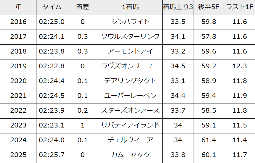 この世代をずっと見てきた人からは共感を得られると思っているが今年の3歳牝馬 “中距離路線” は正直低レベル(時計的な意味で。馬自身を貶めているわけではない)。遡ると2歳時からその傾向があるのだが、最もわかりやすいのはオークス。過去10年で最も遅い決着タイムであり、当時の馬場水準を考えるとかなり遅い。しかもそれに加えて後半ラップがそれほど速くない+減速ラップというのが個人的には更に評価を下げる要因。そんなオークスでも世代で最もレベルが高かったのはこのレースだと思うので春までに台頭してきた馬全体のレベルが低かったと言える。