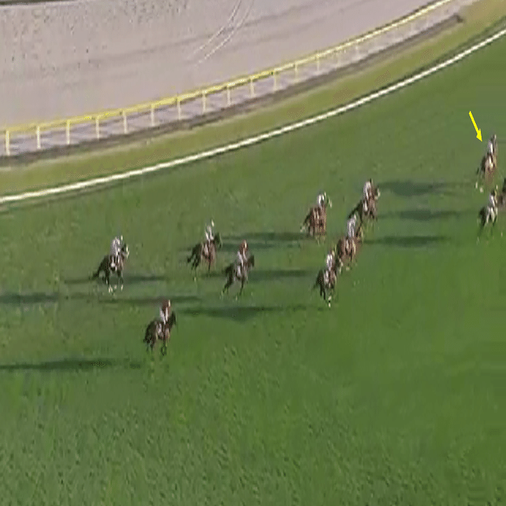 さらにその東スポ杯2歳Sでは上位3頭が抜けて強かったと考えている。一番わかりやすいのはゴール後の映像。上位3頭だけ他の馬を引き離して伸び続けていることがわかる(以下の黄色矢印で示したのが3着ライヒスアドラー)。