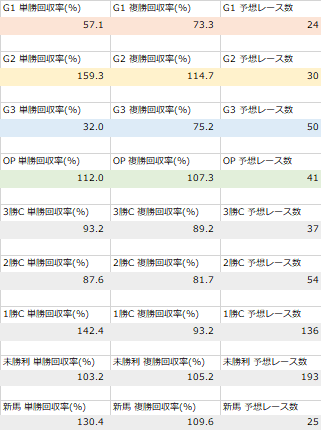 ちなみにレースのクラスごとに本命馬成績を分けた結果は以下の通り。プロフィールにも書いている通り世代戦をかなり得意としており、